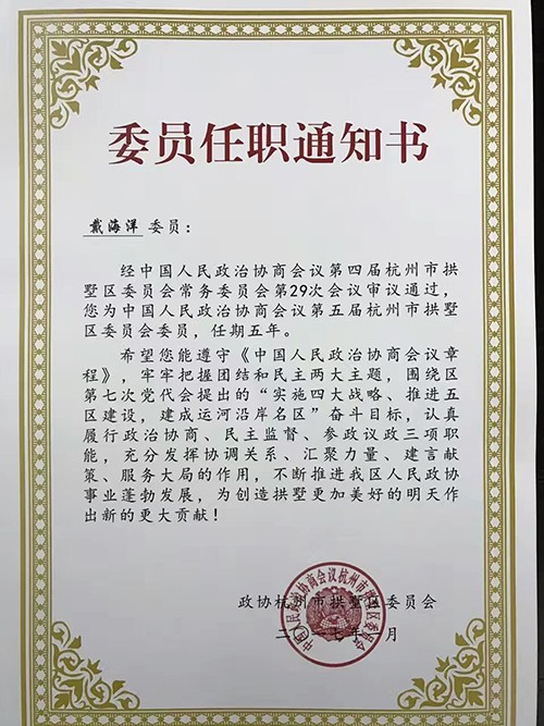 1月18日,政协杭州市拱墅区委员会正式下发委员任职通知书,杭州建华文创集团股份有限公司董事长、总裁戴海洋先生当选为中国人民政治协商会议第五届杭州市拱墅区委员会委员,任期五年。