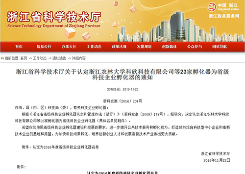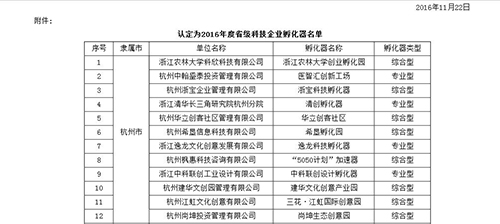 11月23日,浙江省科学技术厅发布《关于认定浙江农林大学科欣科技有限公司等23家孵化器为省级科技企业孵化器的通知》(浙科发高〔2016〕204号),建华文创集团旗下建华文创园被认定为2016年度省级科技企业孵化器。