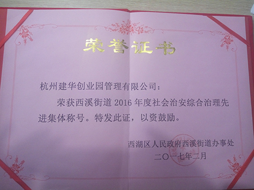 近日,杭州建华文创集团旗下建华创业园荣获西溪街道“2016年度社会治安综合治理先进集体”称号。