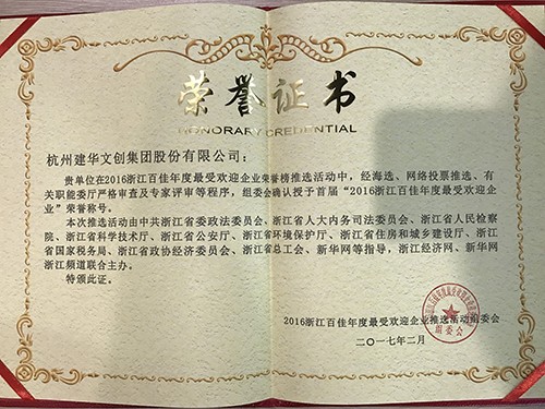 经过前期海选、网络投票推选和有关职能机关组织处严格审查、专家评审后,“2016浙江百佳年度最受欢迎企业”评选结果揭晓。杭州建华文创集团股份有限公司以独特的商业创新能力、诚信和谐的企业管理理念以及强烈的社会责任感荣登榜单。