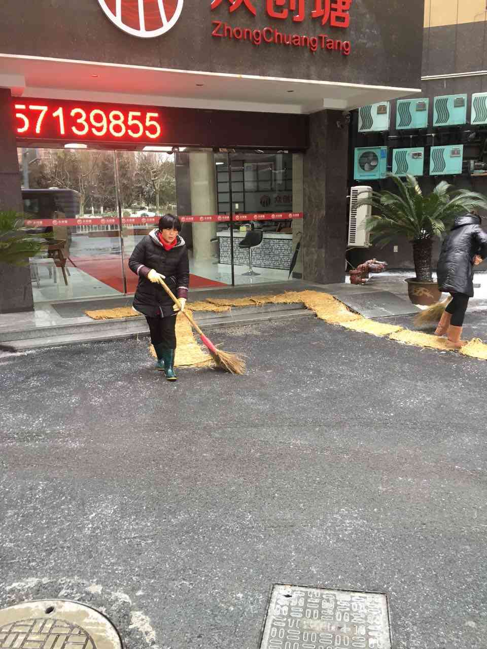 2016年1月23日,杭州气氛骤降,我们迎来了今年冬天真正意义上的一场大雪,雪花随着大风漫天飞舞,很快使整个大地都披上了白袄,分外壮观。大雪过后,明珠大厦门口、内外主干道上都积了厚厚的一层雪,为员工和来访客人的出行带来诸多不便。因此,为保证公司主干道的畅通和大家安全行走,众创塘管理中心组织开展了一场清除积雪大扫除活动。