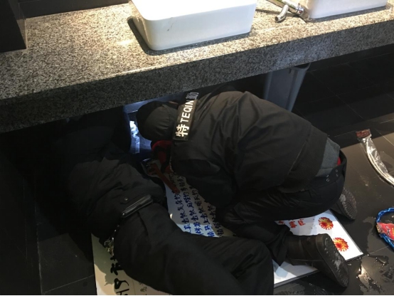 图为保安和电工一起抢修冻裂的水表水管。